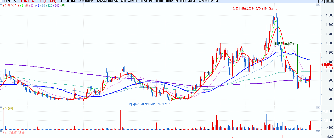 - 아센디오 (1,071원 ▲ 16.41% , 시총: 1,109억, 거래량: 4,551,017, 거래대금:46억)