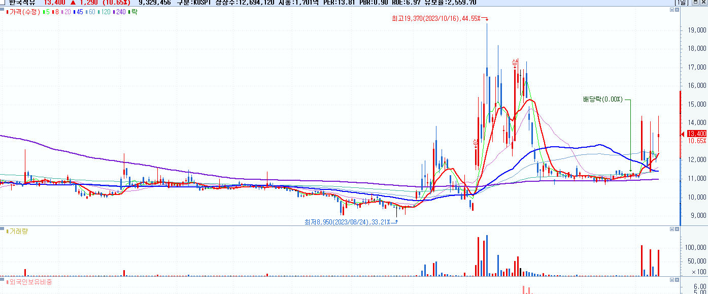 - 한국석유 (13,400원 ▲ 10.65% , 시총: 1,701억, 거래량: 9,332,556, 거래대금:1,269억)