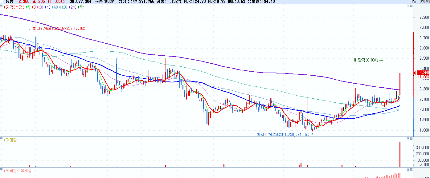 - 동방 (2,360원 ▲ 11.06% , 시총: 1,132억, 거래량: 38,767,905, 거래대금:926억)