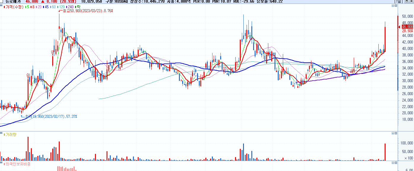 - 뉴로메카 (46,800원 ▲ 20.93% , 시총: 4,889억, 거래량: 10,069,449, 거래대금:4,547억)