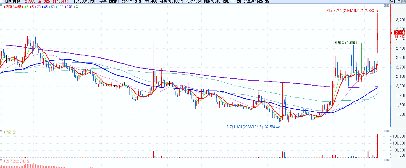 - 대한해운 (2,565원 ▲ 14.51% , 시총: 8,187억, 거래량: 165,054,729, 거래대금:4,284억)