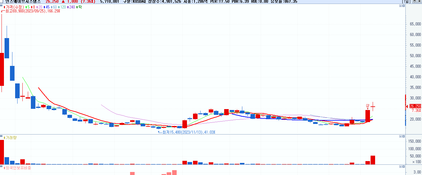 - 인스웨이브시스템즈 (26,250원 ▲ 7.36% , 시총: 1,287억, 거래량: 5,711,275, 거래대금:1,499억)