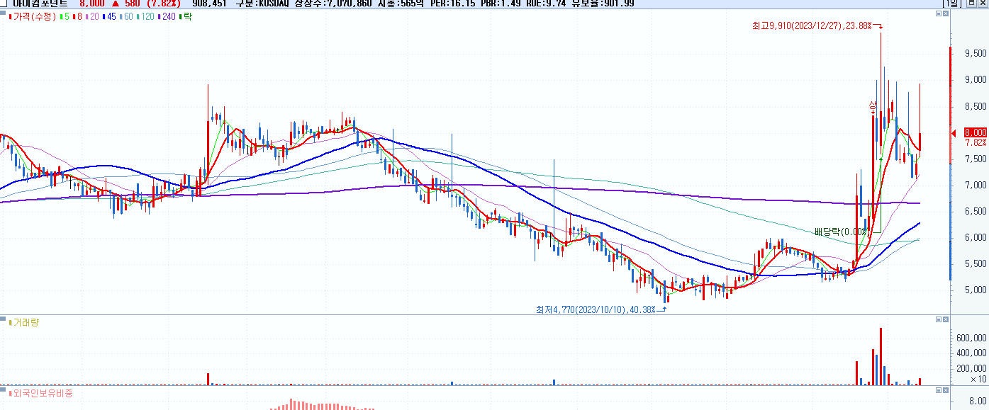- 아이컴포넌트 (8,000원 ▲ 7.82% , 시총: 566억, 거래량: 908,451, 거래대금:74억)