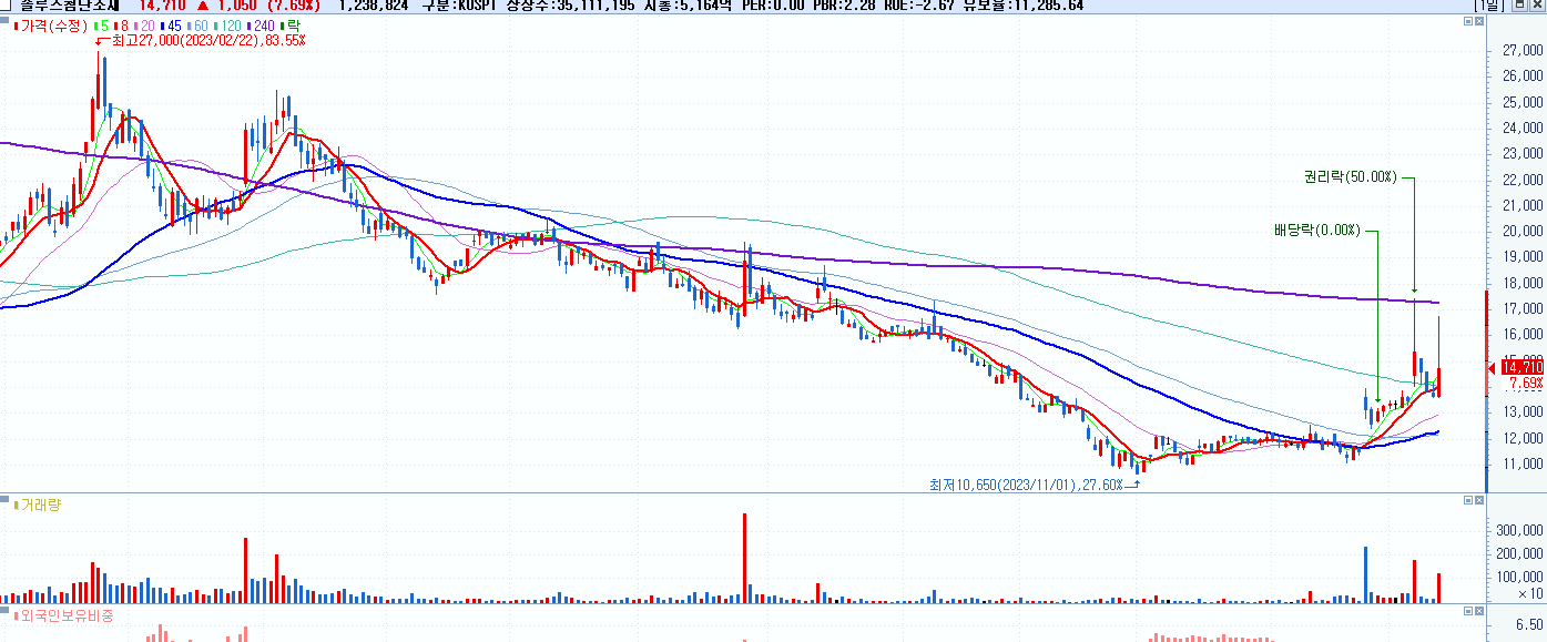 - 솔루스첨단소재 (14,710원 ▲ 7.69% , 시총: 5,165억, 거래량: 1,238,833, 거래대금:192억)