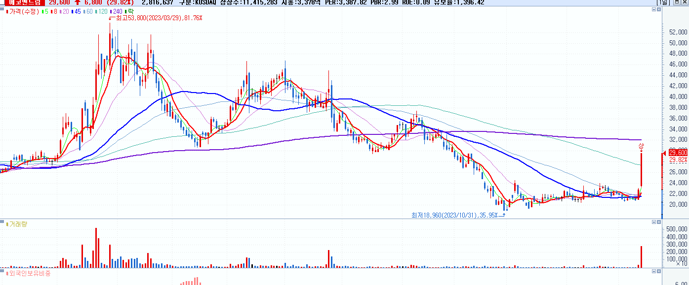 - 에코앤드림 (29,600원 ▲ 29.82% , 시총: 3,379억, 거래량: 2,816,666, 거래대금:778억)