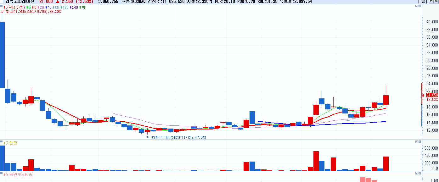 - 레뷰코퍼레이션 (21,050원 ▲ 12.63% , 시총: 2,336억, 거래량: 3,879,033, 거래대금:830억)