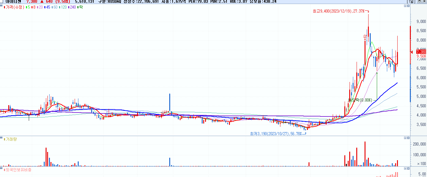 - 아이티센 (7,380원 ▲ 9.5% , 시총: 1,676억, 거래량: 5,613,089, 거래대금:426억)