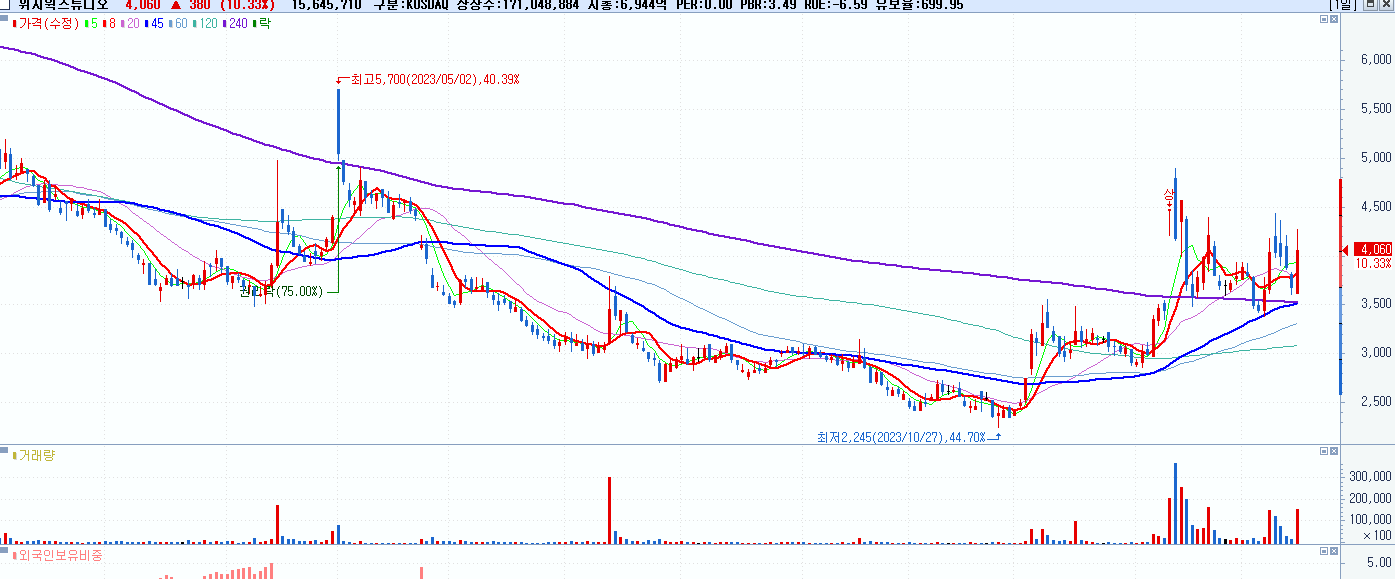 - 위지윅스튜디오 (4,060원 ▲ 10.33% , 시총: 6,945억, 거래량: 15,653,401, 거래대금:636억)