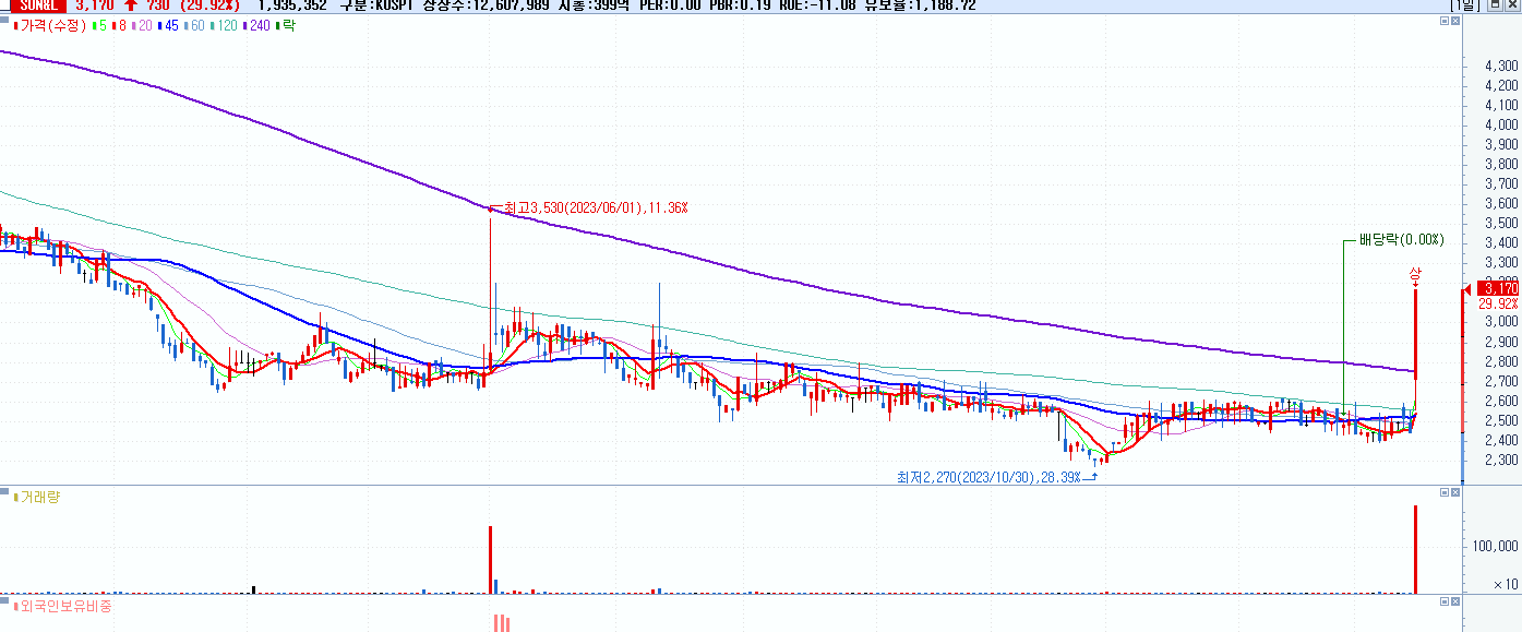 - SUN&L (3,170원 ▲ 29.92% , 시총: 400억, 거래량: 1,935,352, 거래대금:60억)