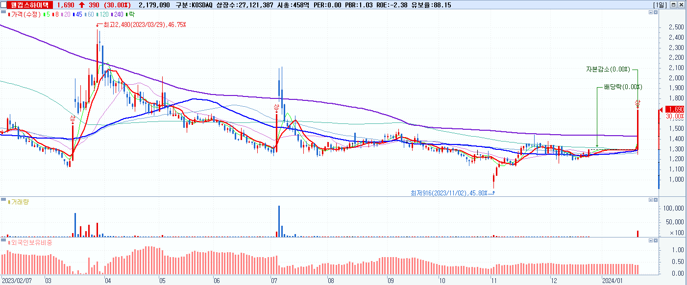 1.웰킵스하이텍 1,690원 ▲ 30% (KOSDAQ, 043590)