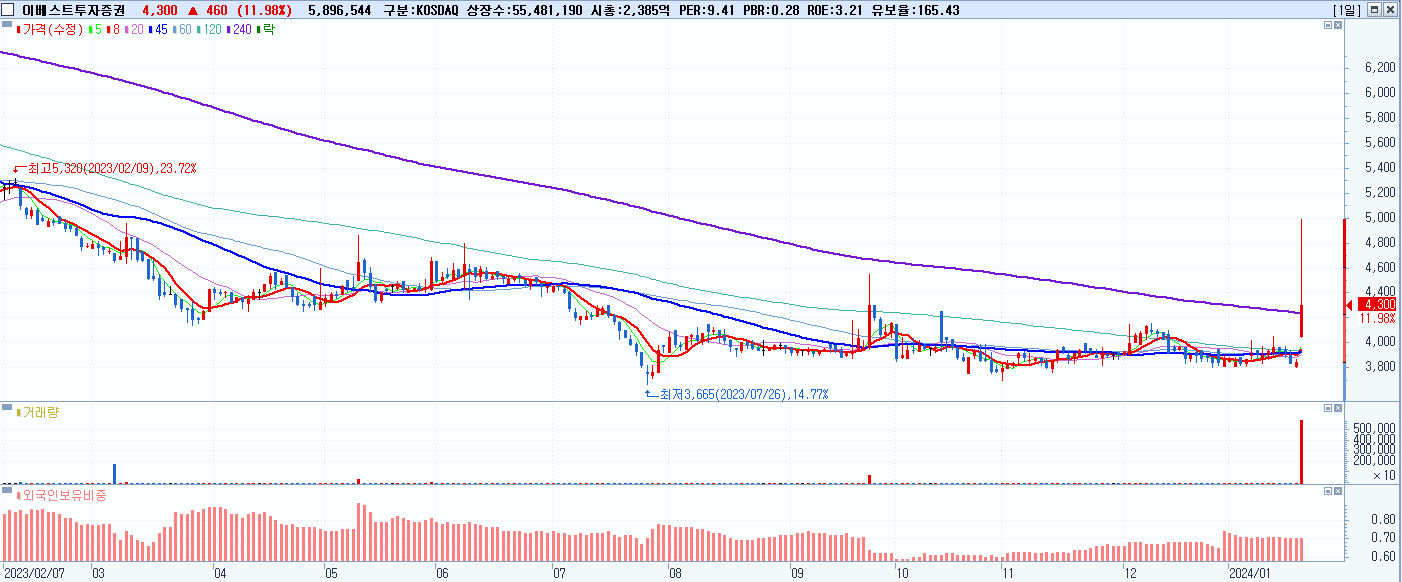 - 이베스트투자증권 (4,300원 ▲ 11.98% , 시총: 2,386억, 거래량: 5,900,897, 거래대금:273억)