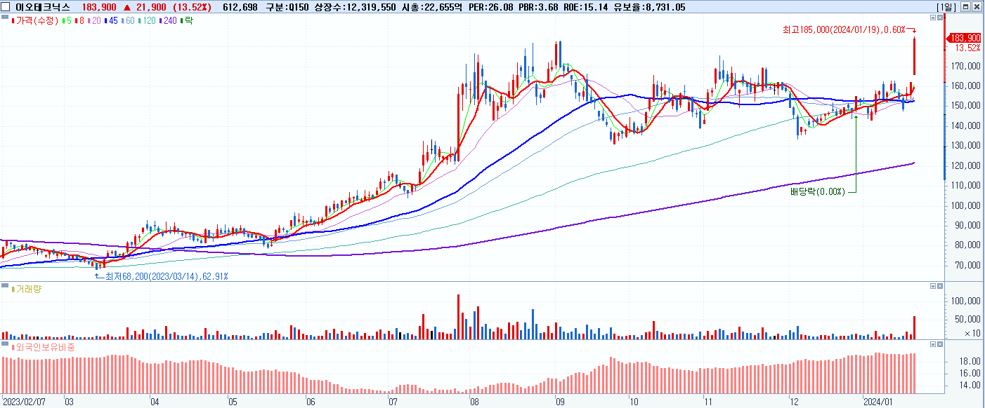 - 이오테크닉스 (183,900원 ▲ 13.52% , 시총: 22,656억, 거래량: 613,046, 거래대금:1,078억)