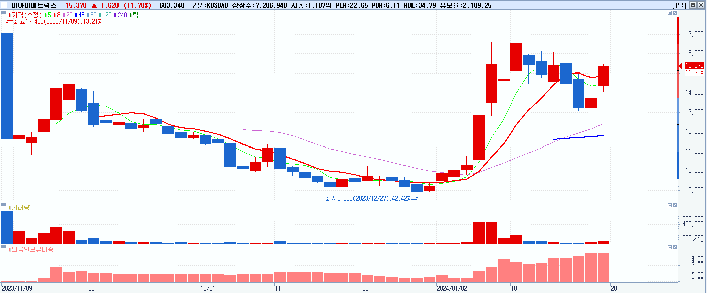 - 비아이매트릭스 (15,370원 ▲ 11.78% , 시총: 1,108억, 거래량: 603,598, 거래대금:90억)