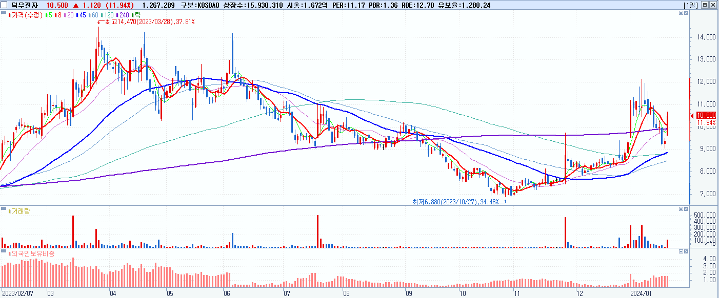 - 덕우전자 (10,500원 ▲ 11.94% , 시총: 1,673억, 거래량: 1,267,334, 거래대금:131억)