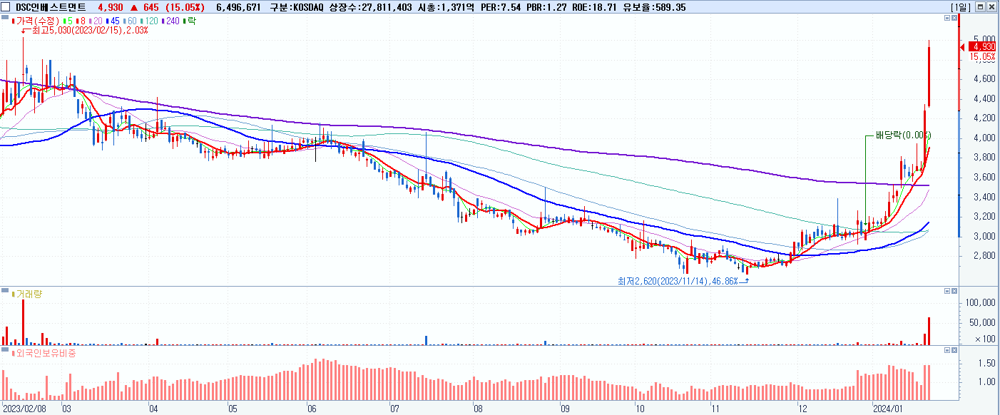 - DSC인베스트먼트 (4,930원 ▲ 15.05% , 시총: 1,371억, 거래량: 6,509,087, 거래대금:310억)