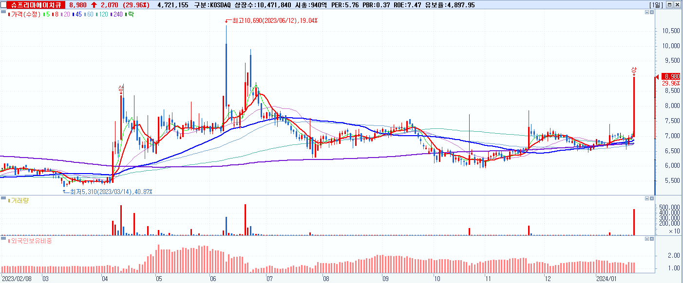 3.슈프리마에이치큐 8,980원 ▲ 29.96% (KOSDAQ, 094840)