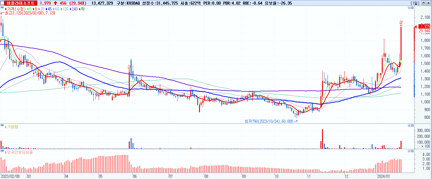 - 비플라이소프트 (1,979원 ▲ 29.94% , 시총: 622억, 거래량: 13,434,351, 거래대금:251억)