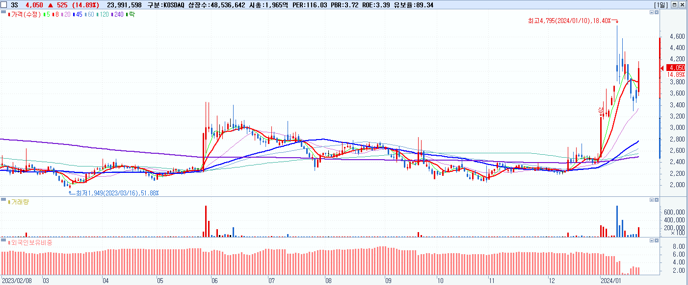 - 3S (4,050원 ▲ 14.89% , 시총: 1,966억, 거래량: 24,022,790, 거래대금:956억)