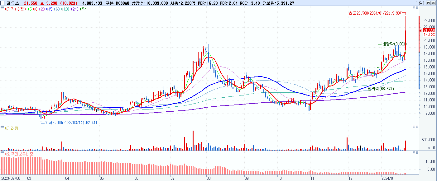 - 제우스 (21,550원 ▲ 18.02% , 시총: 2,228억, 거래량: 4,813,323, 거래대금:1,076억)