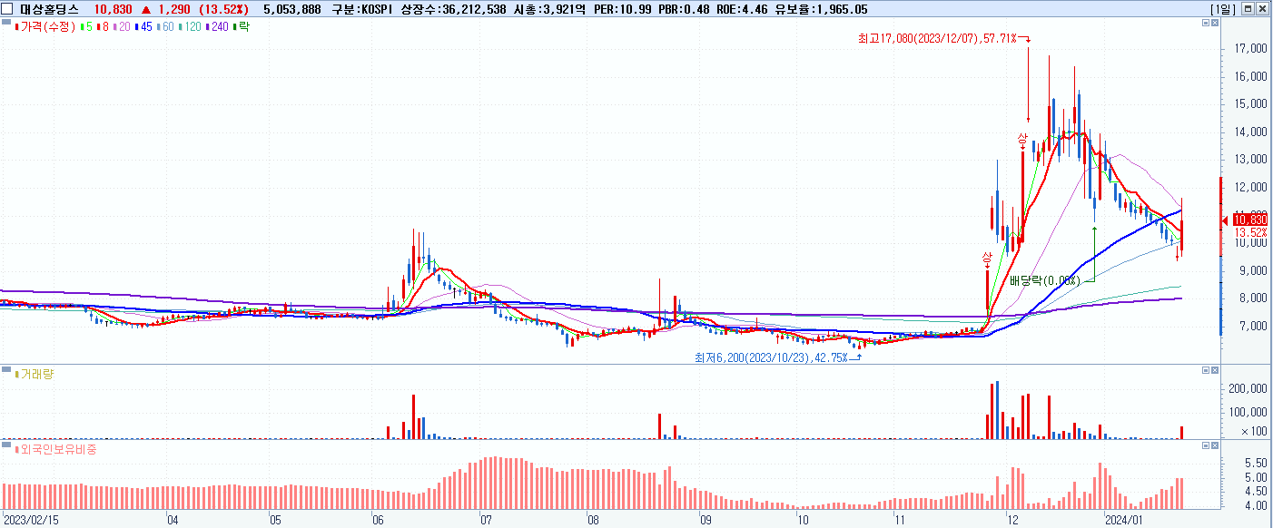 - 대상홀딩스 (10,830원 ▲ 13.52% , 시총: 3,922억, 거래량: 5,057,077, 거래대금:547억)