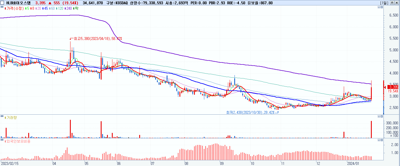 - HLB바이오스텝 (3,395원 ▲ 19.54% , 시총: 2,694억, 거래량: 34,679,635, 거래대금:1,200억)