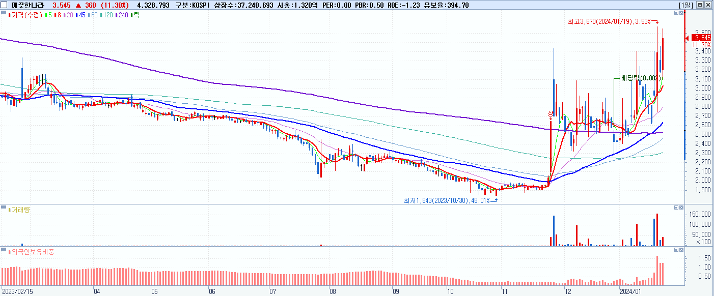 - 깨끗한나라 (3,545원 ▲ 11.3% , 시총: 1,320억, 거래량: 4,340,893, 거래대금:148억)