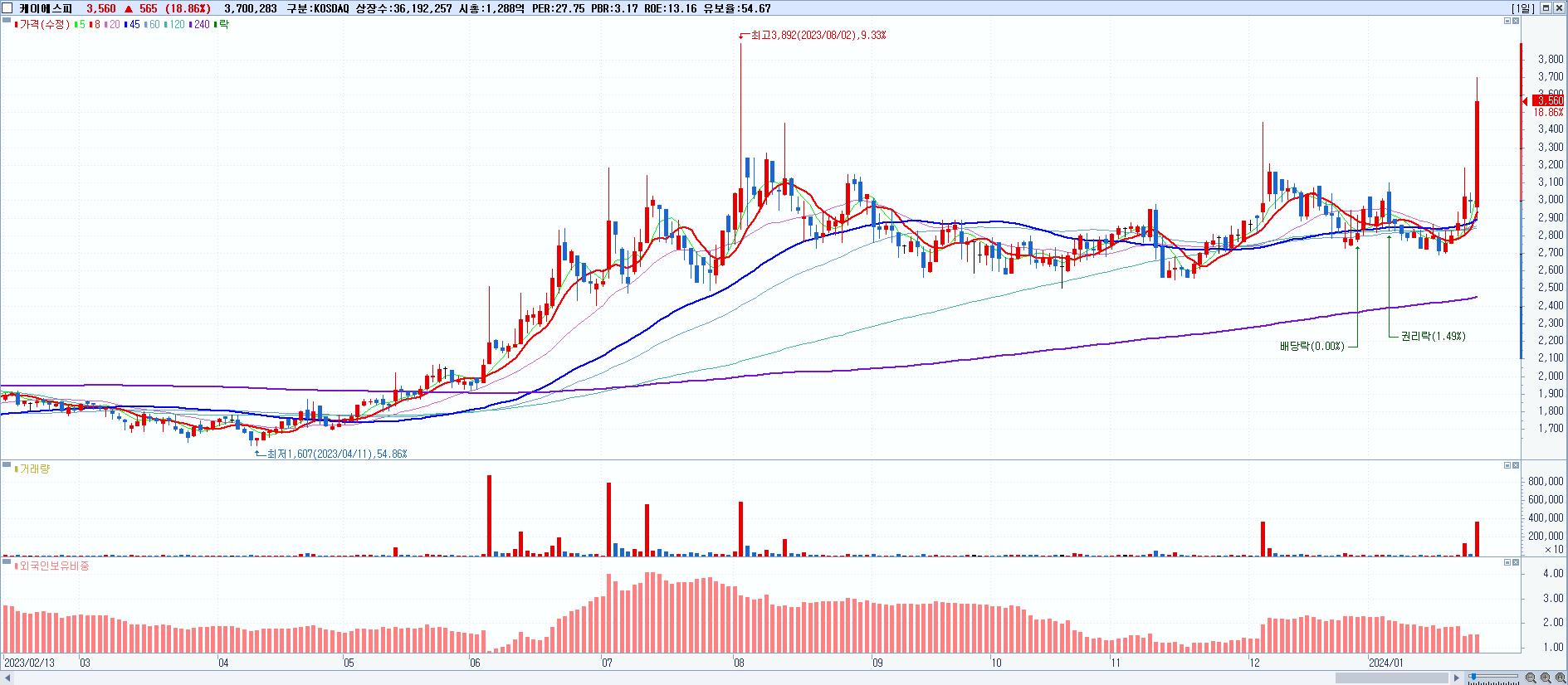 - 케이에스피 (3,560원 ▲ 18.86% , 시총: 1,288억, 거래량: 3,725,596, 거래대금:127억)