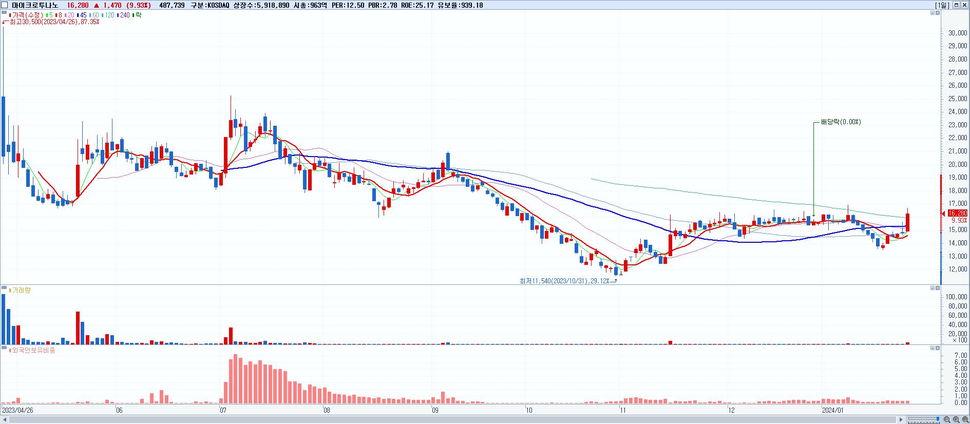 - 마이크로투나노 (16,280원 ▲ 9.93% , 시총: 964억, 거래량: 488,720, 거래대금:79억)