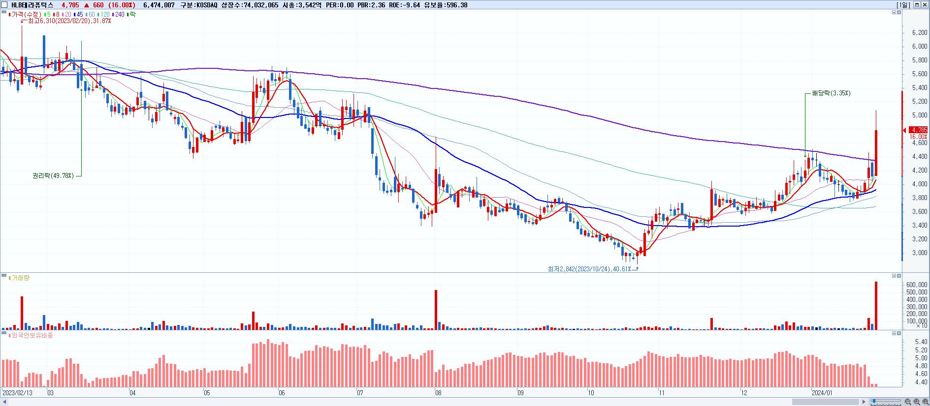 - HLB테라퓨틱스 (4,785원 ▲ 16% , 시총: 3,542억, 거래량: 6,509,050, 거래대금:306억)
