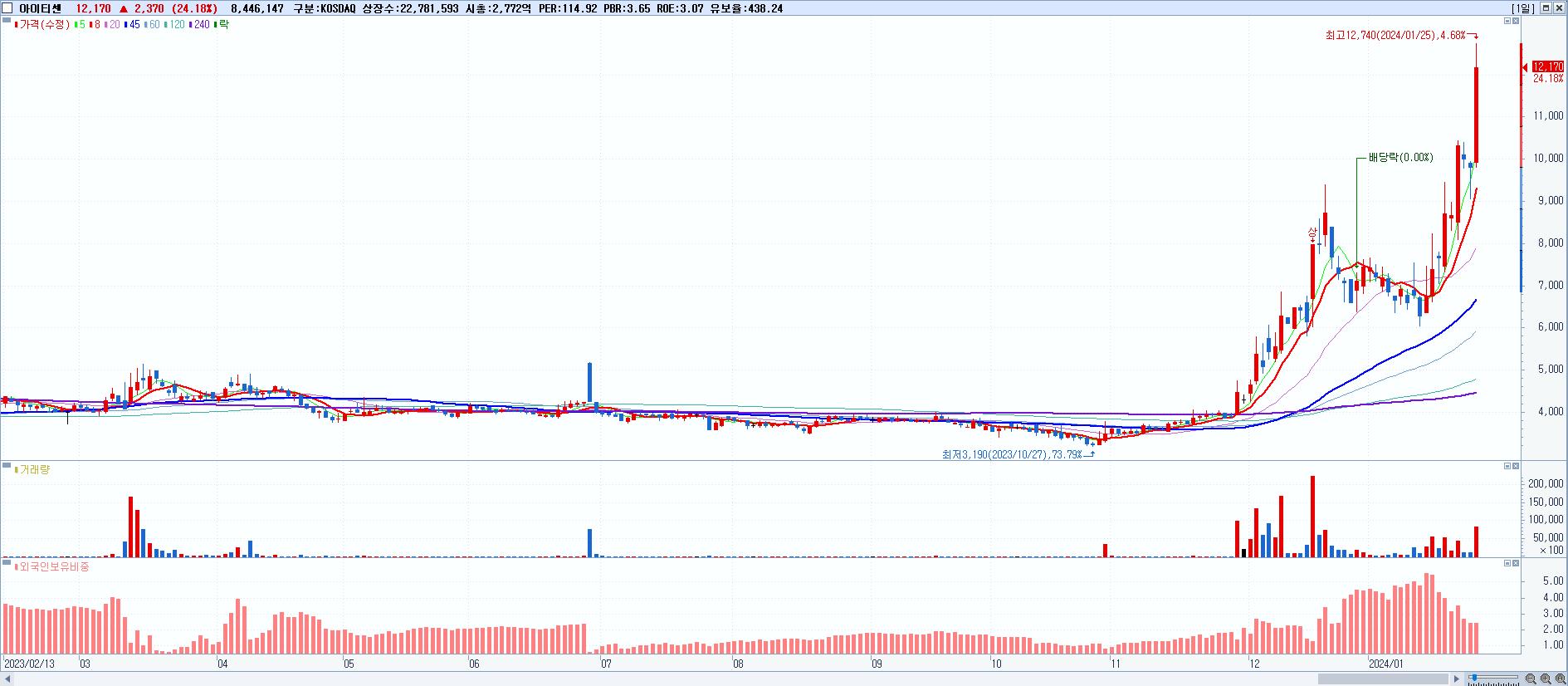 - 아이티센 (12,170원 ▲ 24.18% , 시총: 2,773억, 거래량: 8,467,029, 거래대금:1,012억)