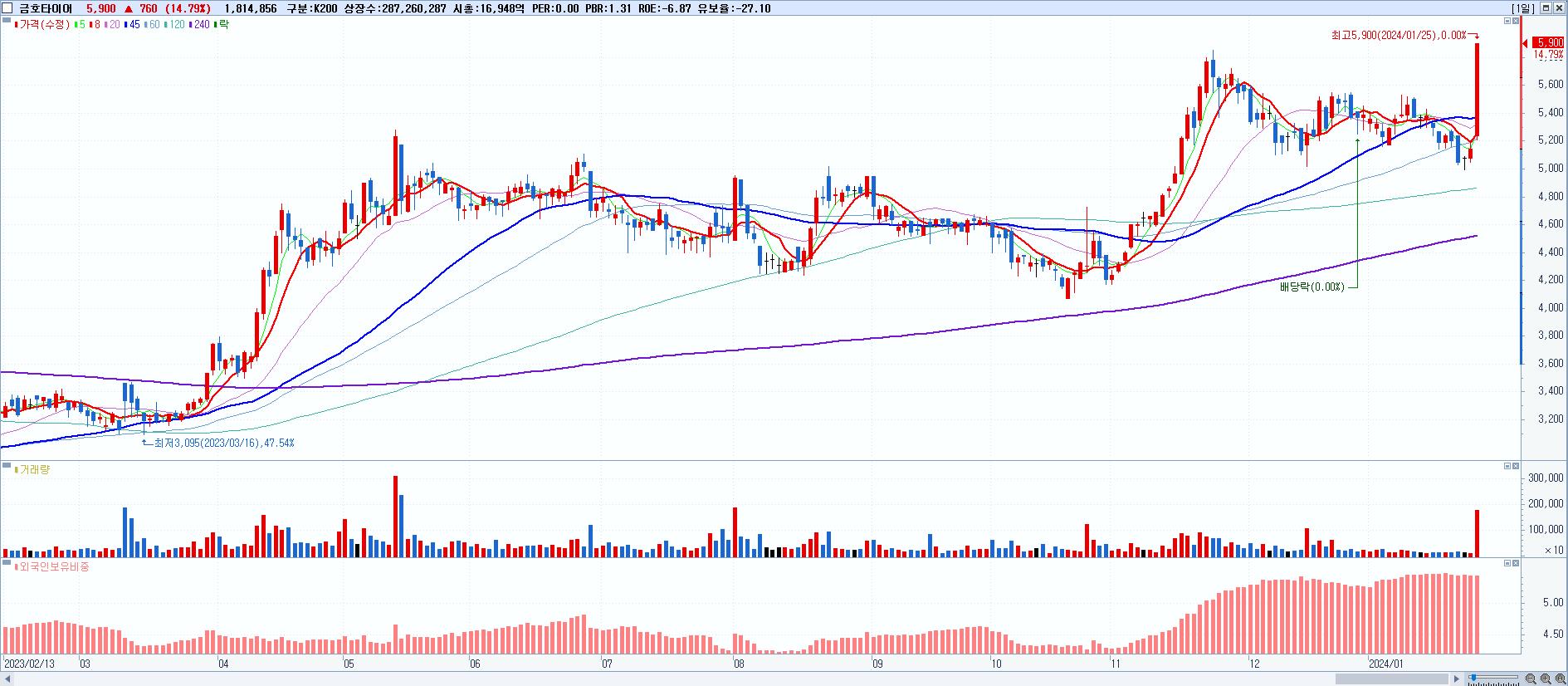 - 금호타이어 (5,900원 ▲ 14.79% , 시총: 16,948억, 거래량: 1,842,014, 거래대금:105억)