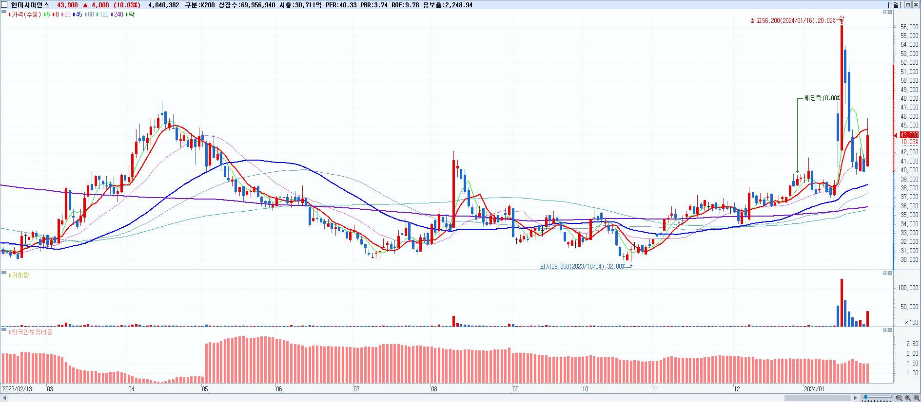- 한미사이언스 (43,900원 ▲ 10.03% , 시총: 30,711억, 거래량: 4,057,290, 거래대금:1,775억)