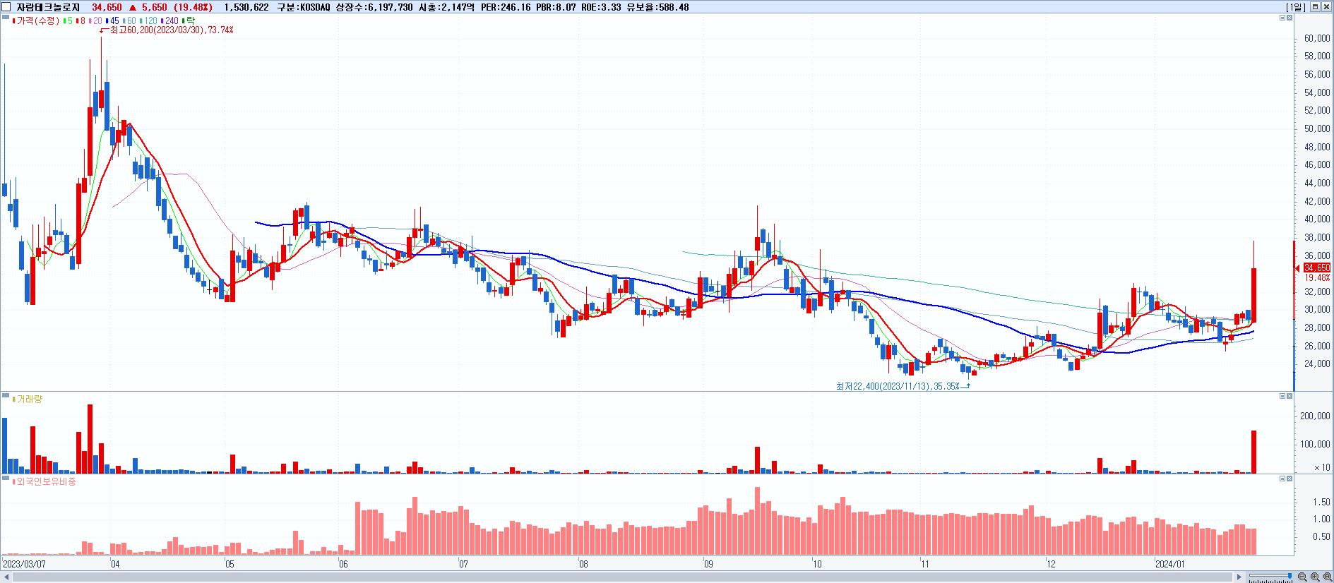 - 자람테크놀로지 (34,650원 ▲ 19.48% , 시총: 2,148억, 거래량: 1,542,363, 거래대금:542억)