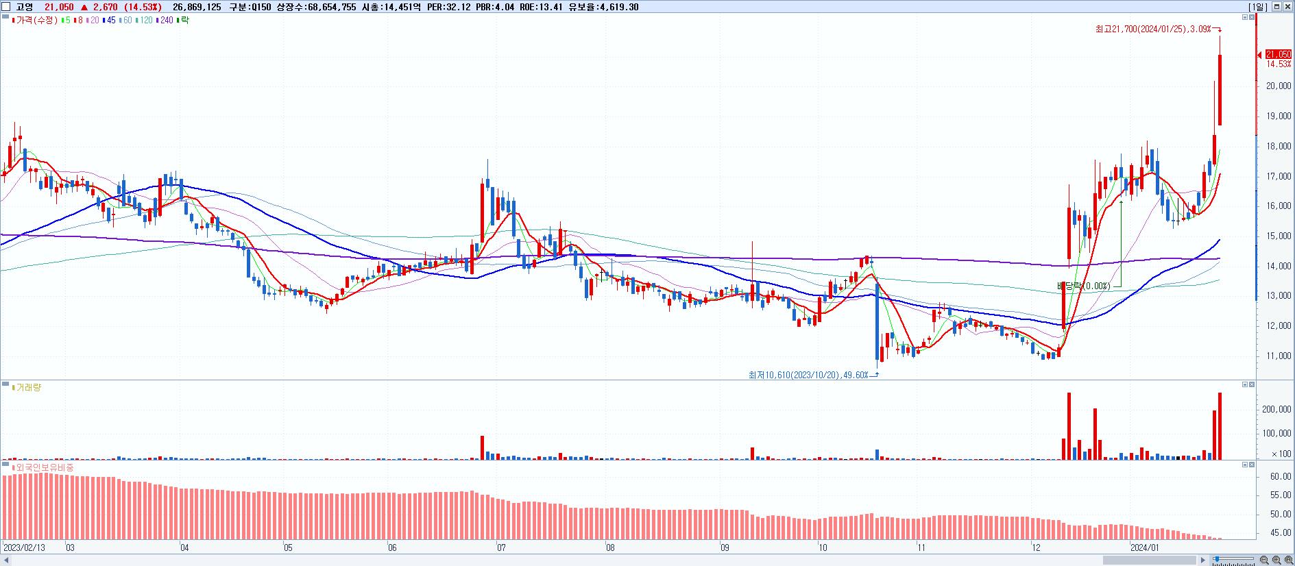 - 고영 (21,050원 ▲ 14.53% , 시총: 14,452억, 거래량: 26,962,337, 거래대금:5,524억)