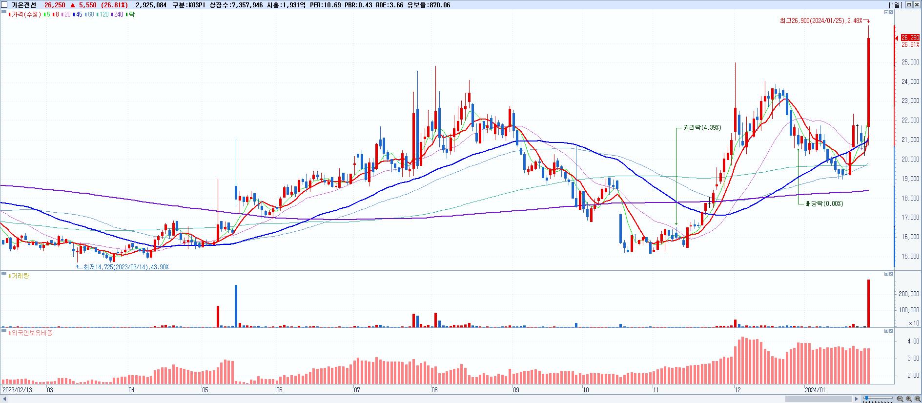 - 가온전선 (26,250원 ▲ 26.81% , 시총: 1,931억, 거래량: 2,934,913, 거래대금:748억)