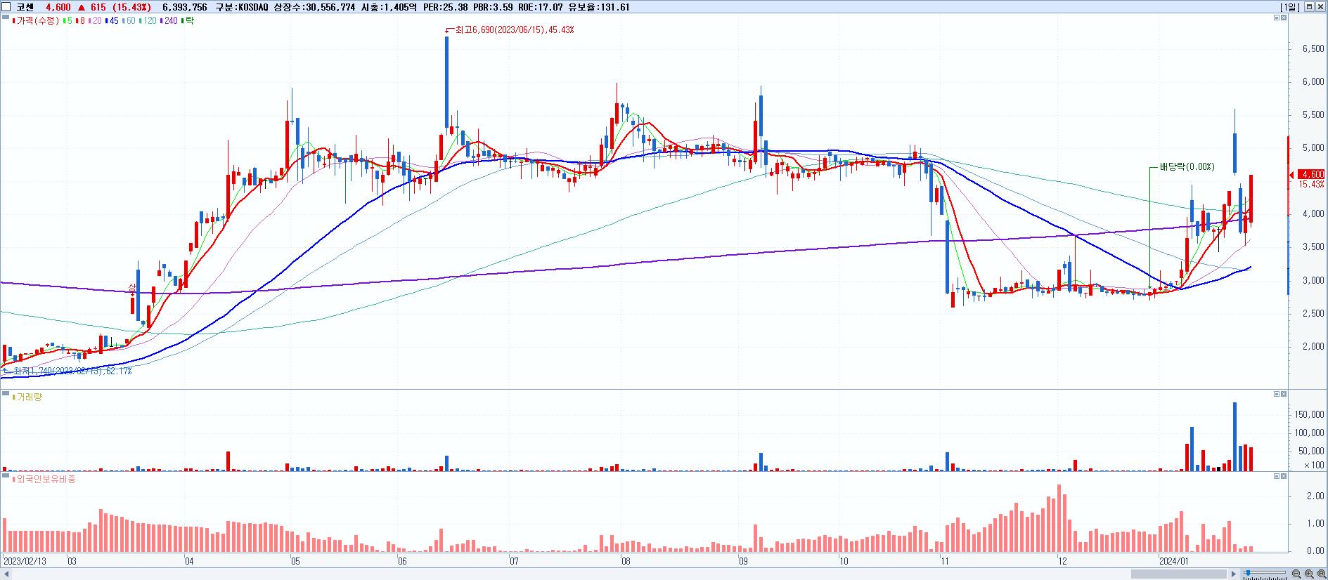 - 코센 (4,600원 ▲ 15.43% , 시총: 1,406억, 거래량: 7,020,858, 거래대금:307억)