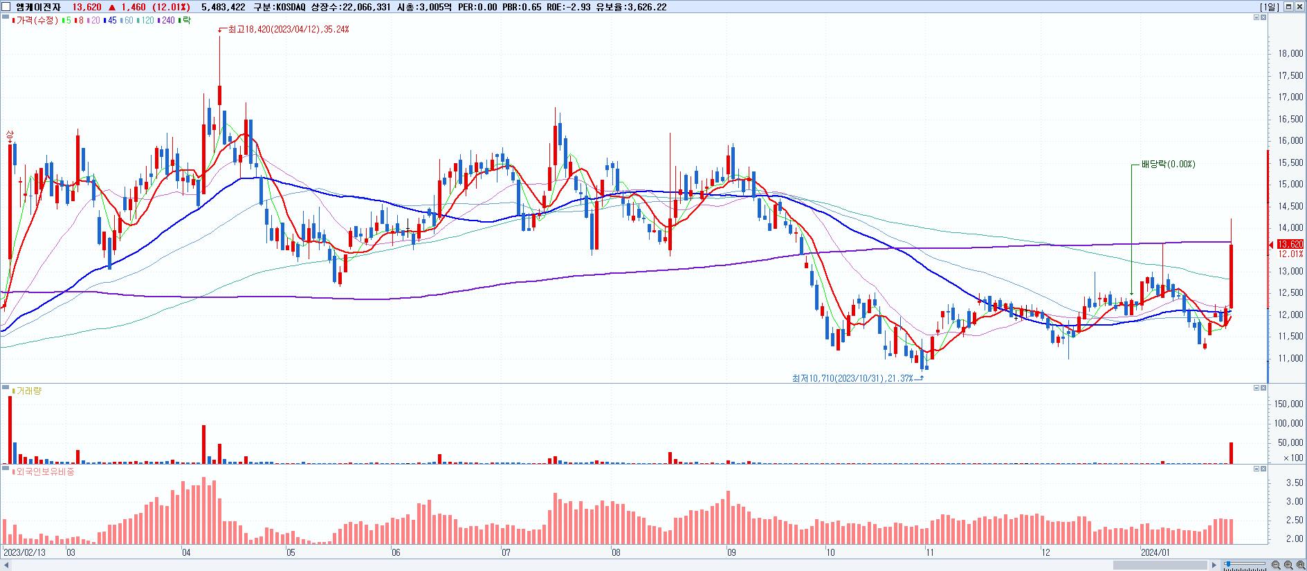 - 엠케이전자 (13,620원 ▲ 12.01% , 시총: 3,005억, 거래량: 5,503,252, 거래대금:749억)