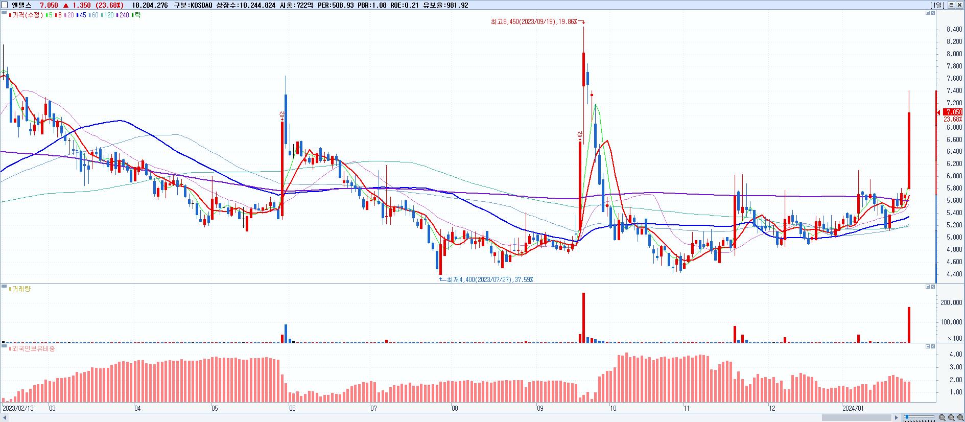 - 엔텔스 (7,050원 ▲ 23.68% , 시총: 722억, 거래량: 18,339,933, 거래대금:1,236억)