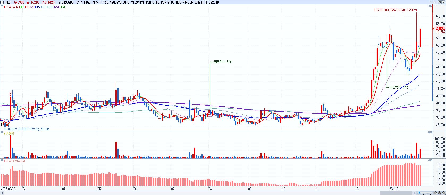 - HLB (54,700원 ▲ 10.51% , 시총: 71,344억, 거래량: 5,087,225, 거래대금:2,699억)