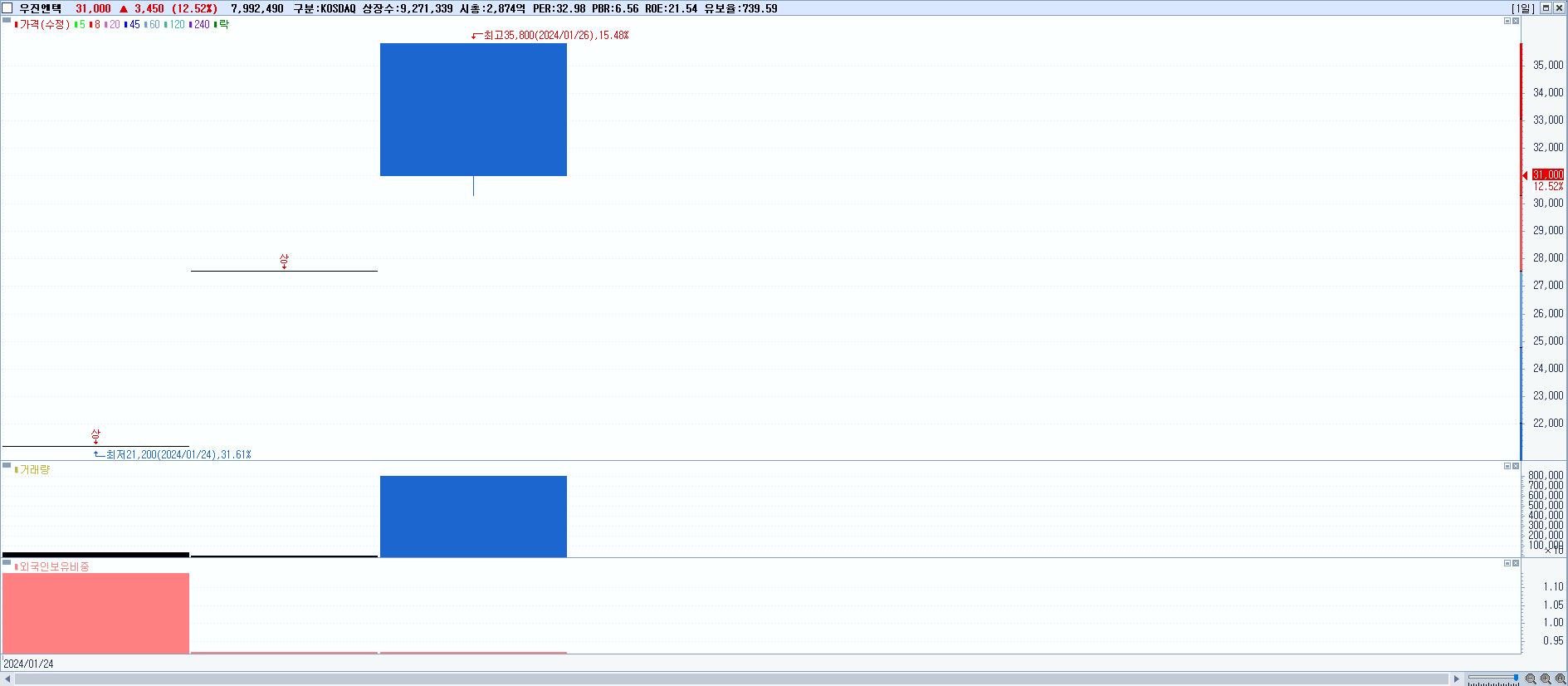 - 우진엔텍 (31,000원 ▲ 12.52% , 시총: 2,874억, 거래량: 8,084,820, 거래대금:2,708억)