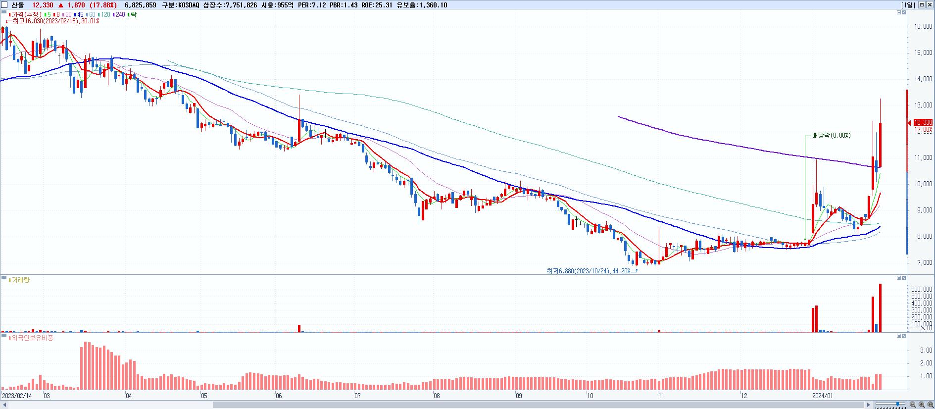 - 산돌 (12,330원 ▲ 17.88% , 시총: 956억, 거래량: 6,839,651, 거래대금:840억)