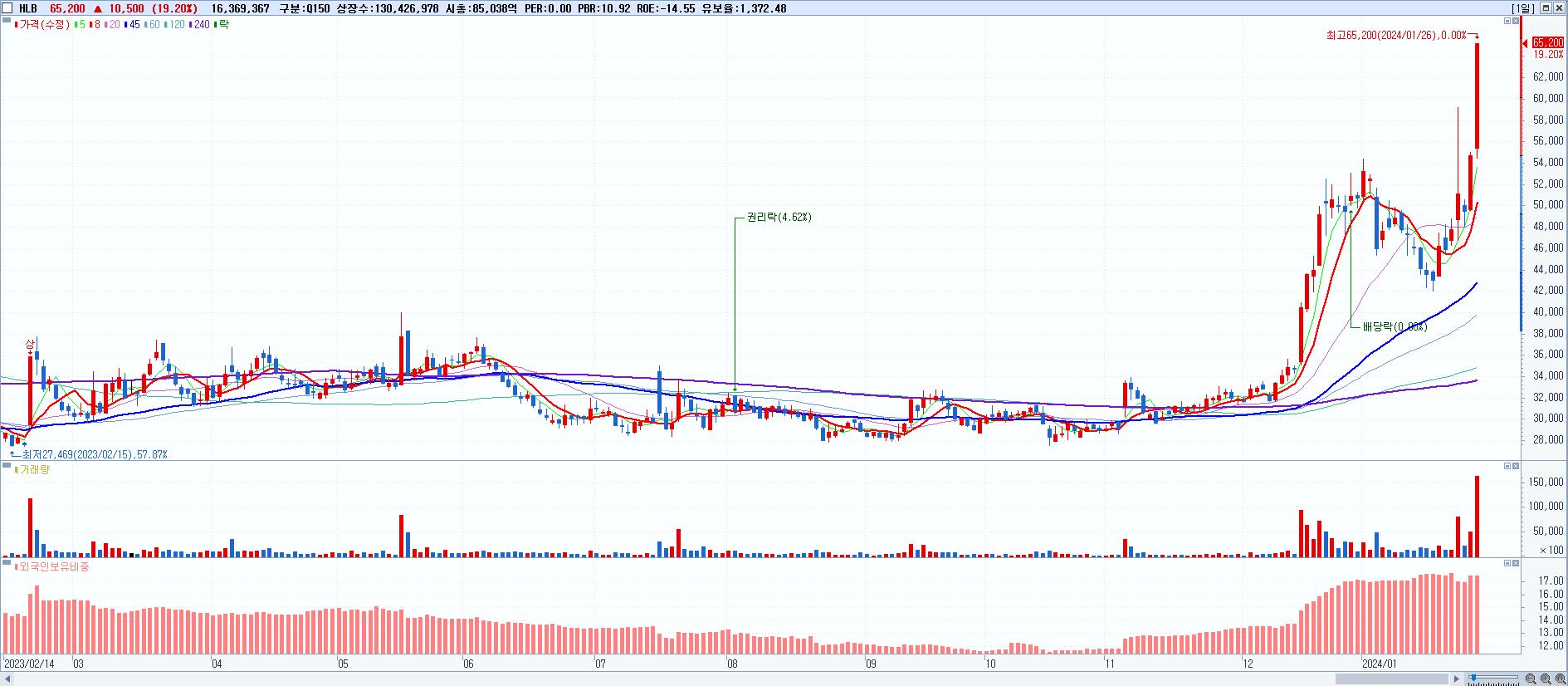 - HLB (65,200원 ▲ 19.2% , 시총: 85,038억, 거래량: 16,488,788, 거래대금:10,227억)