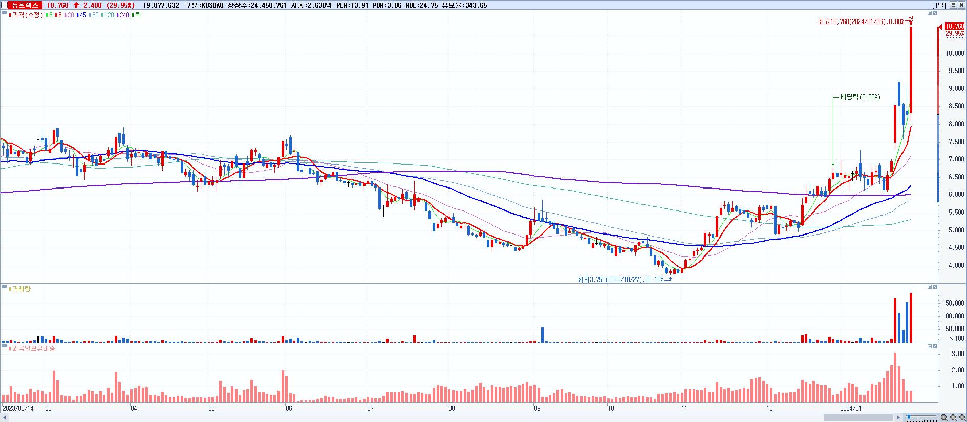 2.뉴프렉스 10,760원 ▲ 29.95% (KOSDAQ, 085670)
