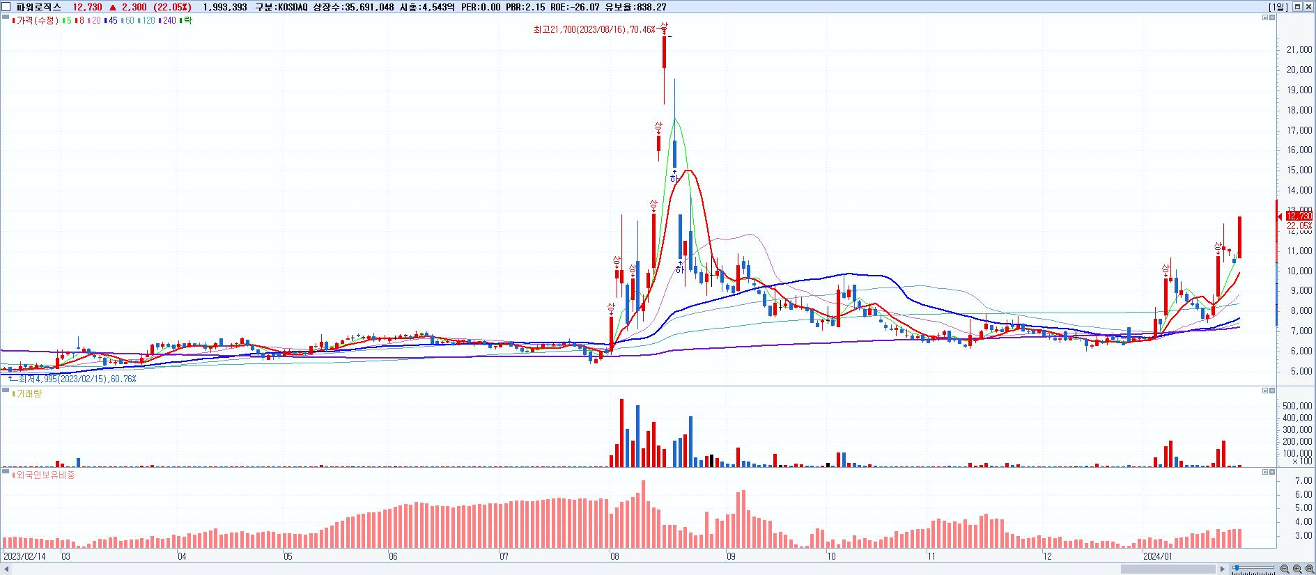 - 파워로직스 (12,730원 ▲ 22.05% , 시총: 4,543억, 거래량: 2,037,344, 거래대금:242억)