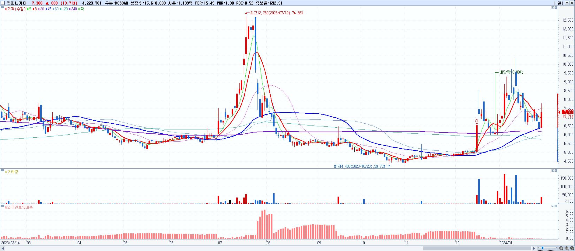 - 컴퍼니케이 (7,300원 ▲ 13.71% , 시총: 1,140억, 거래량: 4,233,492, 거래대금:314억)