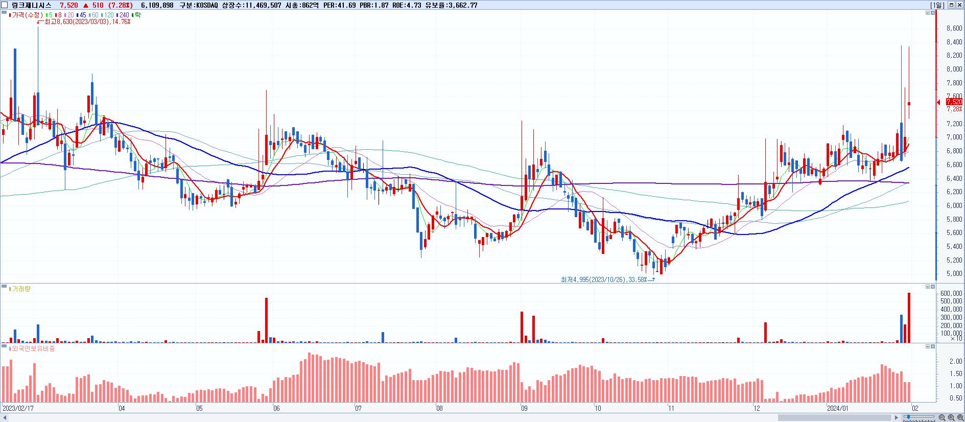 - 링크제니시스 (7,520원 ▲ 7.28% , 시총: 863억, 거래량: 6,119,718, 거래대금:480억)