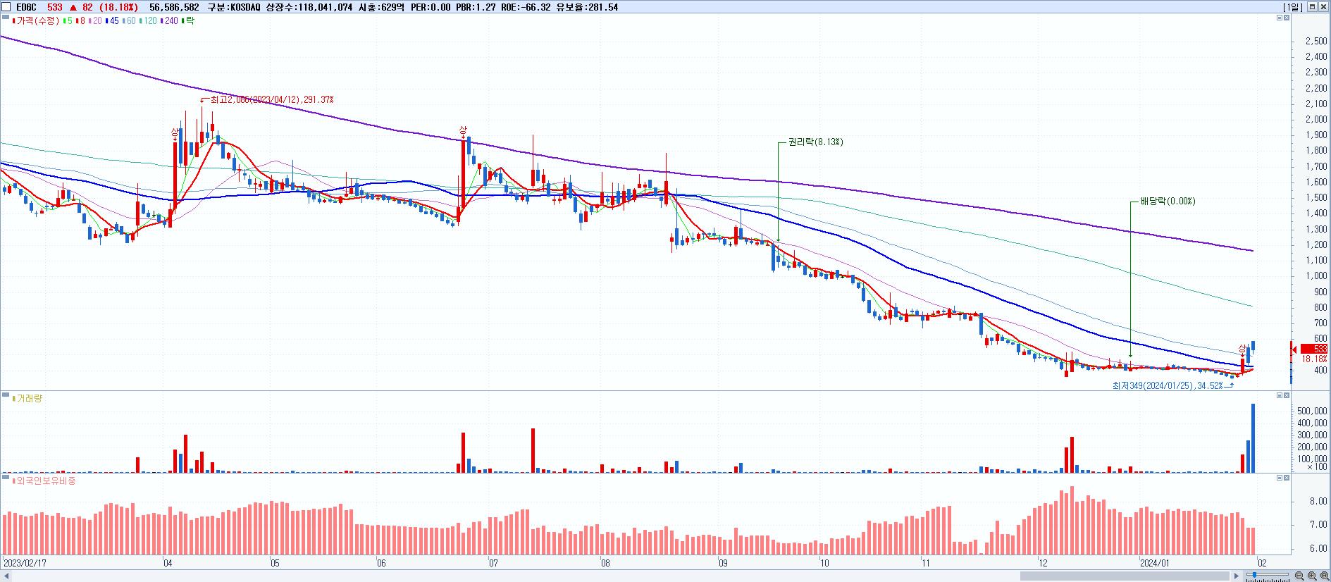 - EDGC (533원 ▲ 18.18% , 시총: 629억, 거래량: 56,845,968, 거래대금:314억)