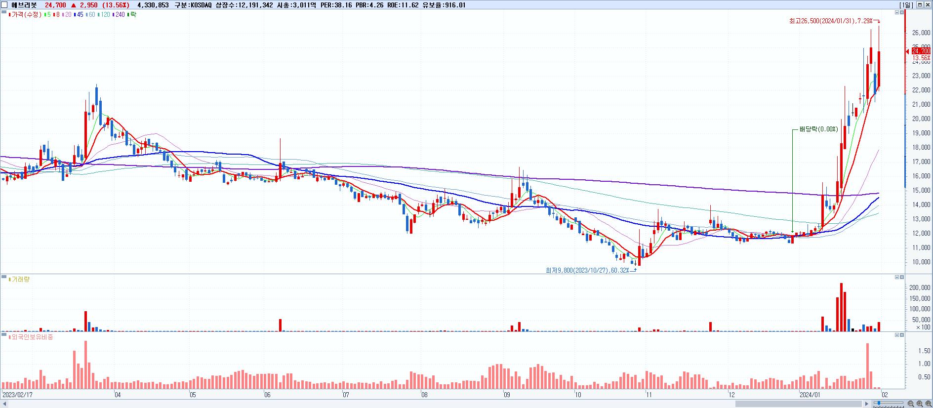 - 에브리봇 (24,700원 ▲ 13.56% , 시총: 3,011억, 거래량: 4,439,473, 거래대금:1,104억)