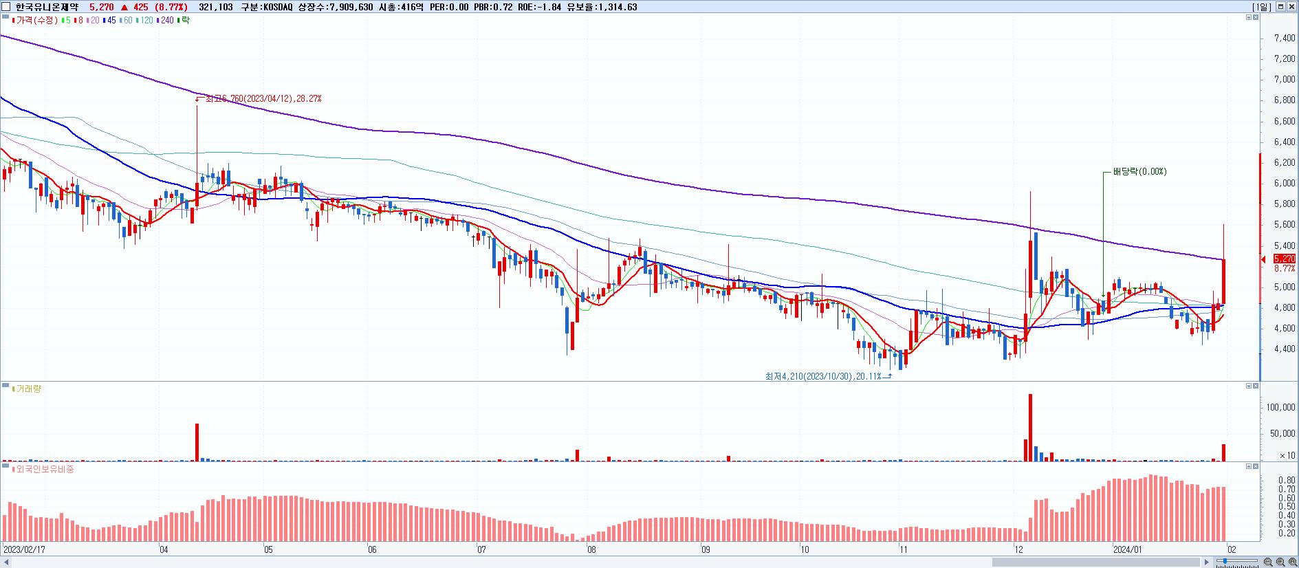 - 한국유니온제약 (5,270원 ▲ 8.77% , 시총: 417억, 거래량: 322,250, 거래대금:17억)