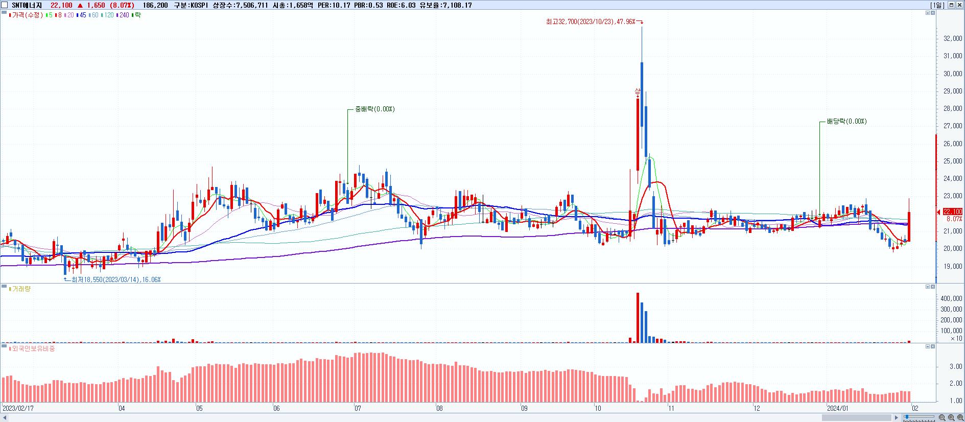 - SNT에너지 (22,100원 ▲ 8.07% , 시총: 1,659억, 거래량: 186,428, 거래대금:41억)